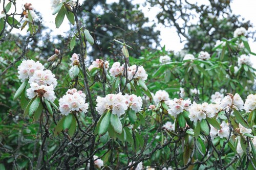 羊角花是一種非常頑強(qiáng)而耐寒的植物。她在高寒陰濕和高山草甸生長,最小的只有幾厘米高,最大的有幾丈高,且根系發(fā)達(dá)、枝繁葉茂,它的花有紅、紫、黃、白等多種,畢棚溝的杜鵑主要是白色和粉色的。白色是一種清爽的白、高貴的白,花瓣像喇叭一樣綻開,粉紅的花蕊色彩柔和、淡雅,不很張揚(yáng),文靜得像閨中的乖女,不含一絲嫵媚。
