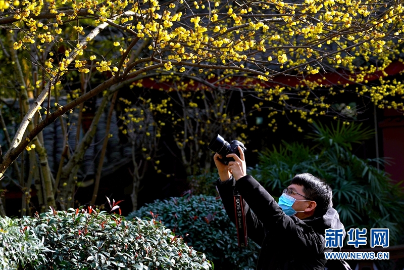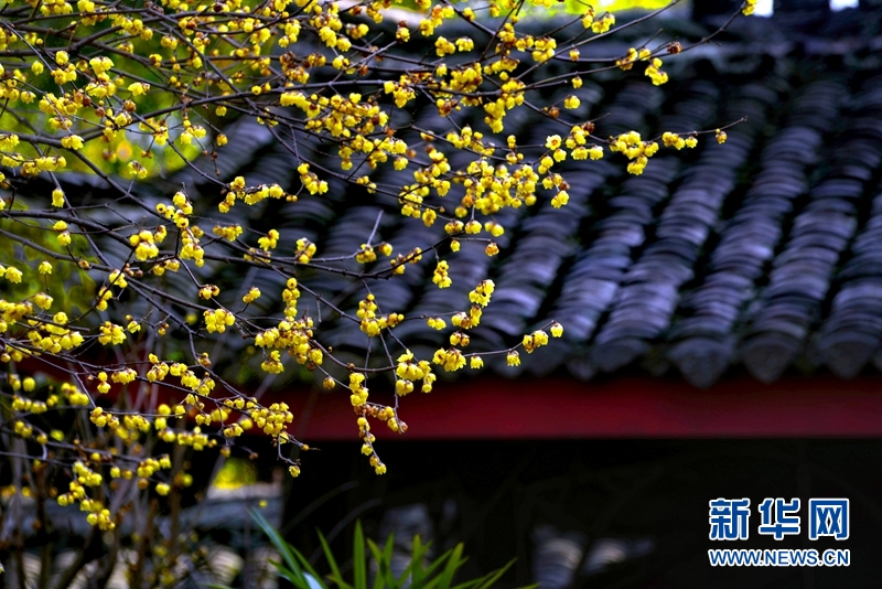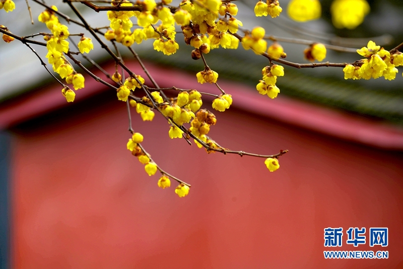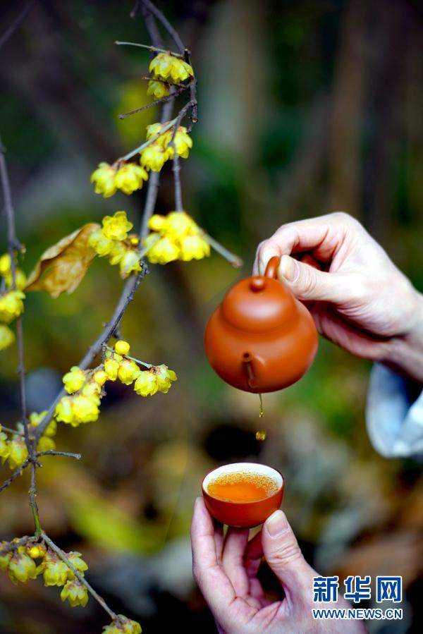 近日,峨眉山報國寺和伏虎寺的蠟梅花開了,紅墻青瓦茶藝秀,花影清幽,花香襲人。(本組圖片攝于1月17日 新華網(wǎng)黎濤攝)
