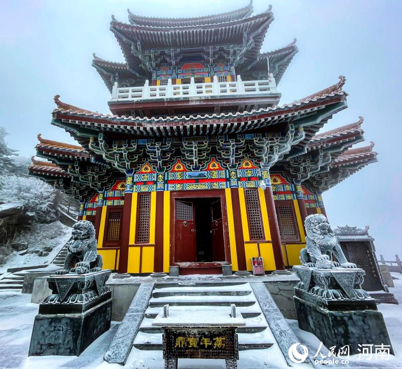 人民網(wǎng)洛陽(yáng)1月25日電(于思遠(yuǎn))24日下午,洛陽(yáng)白云山迎來了2021年第一場(chǎng)雪。持續(xù)幾個(gè)小時(shí)的低溫降雪使得海拔2000多米的白云山披上銀裝,起伏的山巒綿延數(shù)千里,仿佛云海中盤旋的一條白色巨龍,氣勢(shì)宏偉的玉皇閣在冬雪之下顯得更加肅穆莊嚴(yán)。從中原極頂玉皇頂向下望去,云海莽莽,峰起云涌。