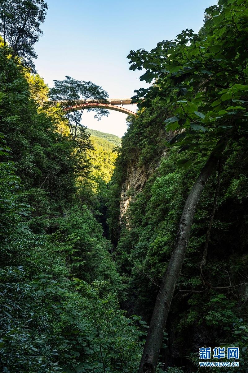 圖為進(jìn)入湖北恩施州建始縣高坪鎮(zhèn)地心谷中的公路橋,如山間彩虹,橫跨深山峽谷。新華網(wǎng)發(fā) 文林?jǐn)z