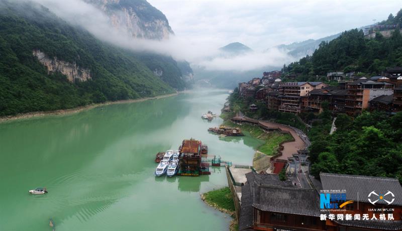 從空中俯瞰龔灘古鎮(zhèn),古老的建筑群沿著一江碧水蜿蜒,靜靜屹立在烏江邊上。古樸的建筑與青山綠水化為一體,猶如一幅天然畫(huà)卷。新華網(wǎng)發(fā)(陳碧生 攝)