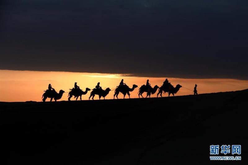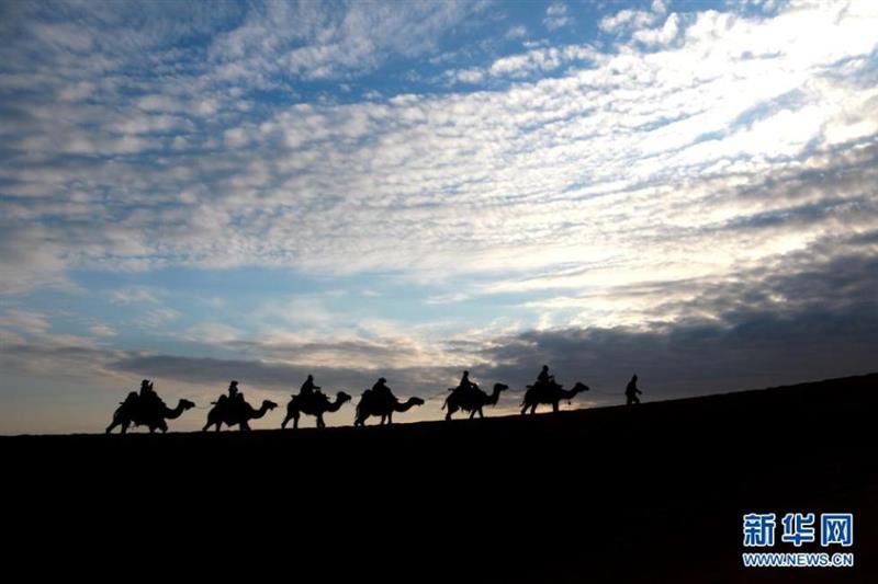 5月15日,游客騎駱駝在甘肅省敦煌市鳴沙山月牙泉景區(qū)游覽。晨光下,云彩、沙山、駝隊(duì)構(gòu)成了一幅美麗迷人的畫卷。新華社發(fā)(張曉亮 攝)