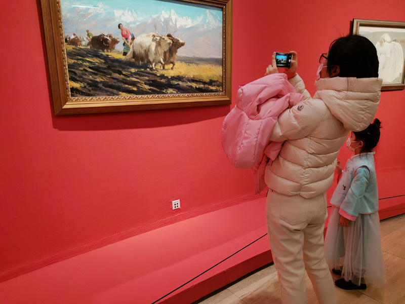 節(jié)假日是觀展旺季。春節(jié)長假期間,中國美術(shù)館網(wǎng)上參觀預(yù)約幾乎全部約滿。館里正在展出的“美在耕耘——中國美術(shù)館2021新年大展喜迎瑞?!碑斎沼瓉砹诵履甑牡谝徊ㄓ^眾,美術(shù)館中人頭攢動,其中有很多小觀眾,他們在長輩親友的帶領(lǐng)下,或認真參觀作品、或席地臨摹,美術(shù)館中充滿了學(xué)習(xí)參觀的氛圍。