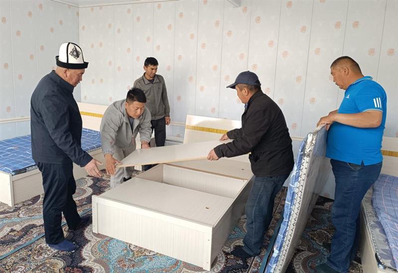 5月6日,斯木哈納村干部和村民在一家民宿內(nèi)組裝床。新華社發(fā)(張飛 攝)