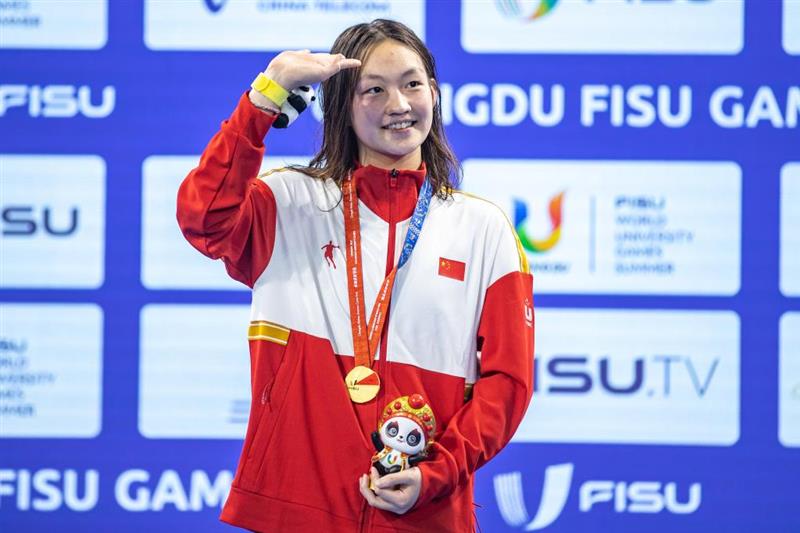 8月4日,李冰潔在頒獎(jiǎng)儀式上。當(dāng)日,在成都舉行的第31屆世界大學(xué)生夏季運(yùn)動(dòng)會(huì)女子1500米自由泳決賽中,中國選手李冰潔以16分18秒48的成績(jī)獲得冠軍。新華社記者 黃偉 攝