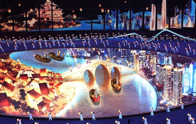 吉祥物“江南憶”破水而出,騰躍而起。“動(dòng)起來(lái)”的“琮琮”“蓮蓮”“宸宸”彈奏起圓形的“水浪鋼琴”,激活了象征著數(shù)字賦能杭州城市建設(shè)的“芯片面板”。660根數(shù)控光源棒點(diǎn)亮“科技之潮”,AR虛擬半球狀的數(shù)字穹頂營(yíng)造出震撼的立體空間。