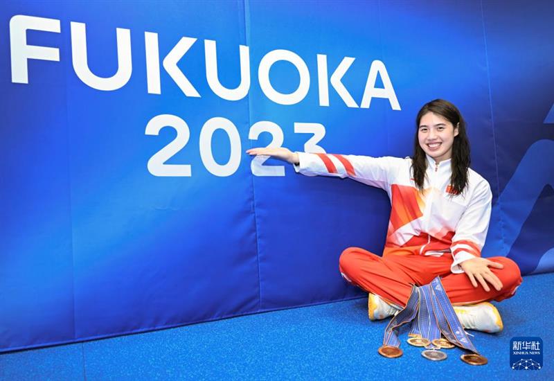 ??這是2023年7月30日,張雨霏在2023年世界游泳錦標(biāo)賽后展示獎牌。新華社記者 夏一方 攝
