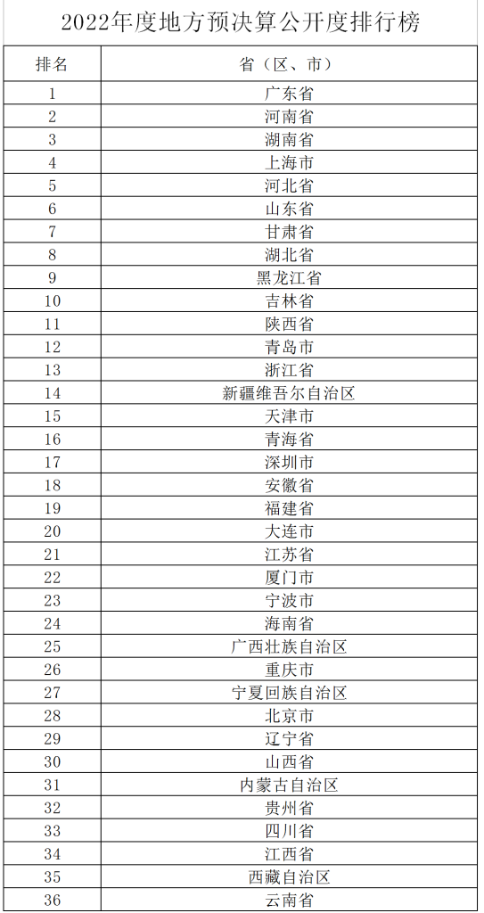 新華社北京4月2日電(記者申鋮)財政部2日對外發(fā)布“2022年度地方預決算公開度排行榜”,廣東、河南、湖南位居榜單前三名。這是2015年以來,財政部第7次在全國范圍內(nèi)開展地方預決算公開檢查。