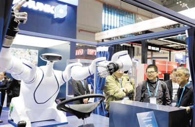 在第二屆進(jìn)博會(huì)裝備展區(qū),一臺(tái)5指機(jī)械手服務(wù)機(jī)器人在進(jìn)行動(dòng)作演示。新華社記者方喆攝