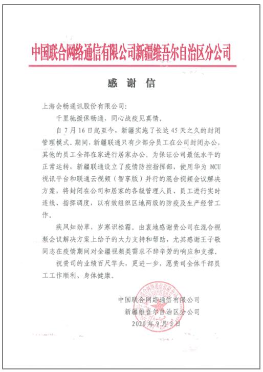 在新疆疫情期間,通過會(huì)暢通訊與聯(lián)通統(tǒng)一打造的云視頻智享版平臺(tái),為超過300家客戶提供了云視頻SaaS賬號(hào),同時(shí)也提供了大量技術(shù)和商務(wù)支撐,獲得新疆聯(lián)通和客戶的贊許。