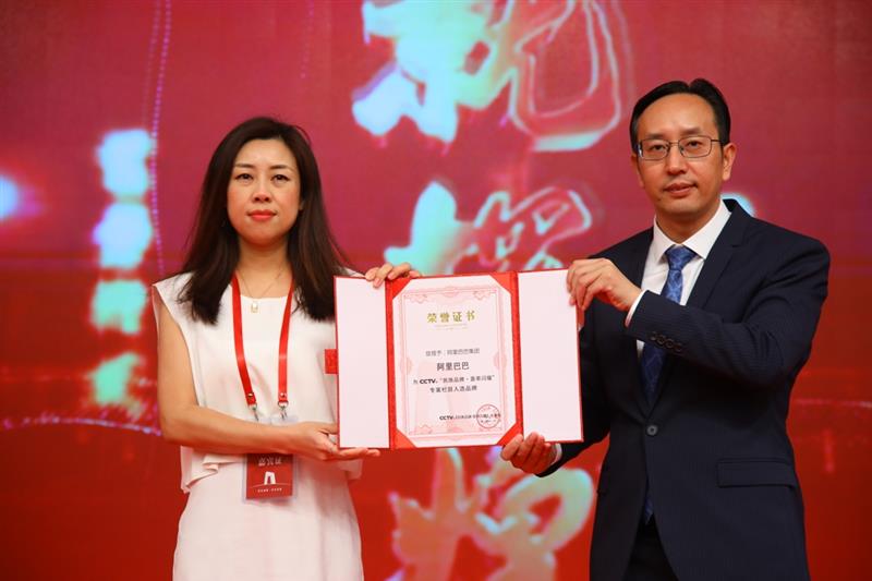 CCTV《民族品牌·薈萃閃耀》專案制片人丁庸為阿里巴巴品牌事業(yè)部特約代表張文秀女士頒發(fā)證書