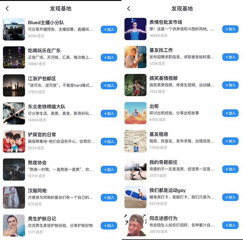 據(jù)了解,“基地”內(nèi)設(shè)有多個興趣版塊,用戶可以根據(jù)共同的興趣和背景選擇加入并進行互動,在興趣相投的背景中,溝通效率大大提高。對此,Blued相關(guān)產(chǎn)品負(fù)責(zé)人表示:“基地功能以興趣為導(dǎo)向,我們希望新添加的功能可以幫助用戶更好地找到志同道合的朋友?!?/span>