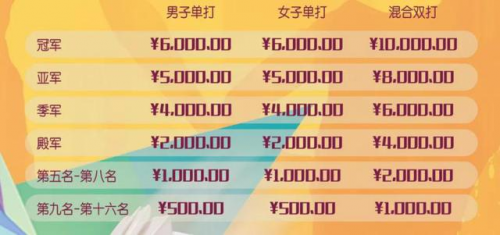 總決賽階段,男子單打、女子單打、混合雙打項目16強,即可瓜分12萬獎金和證書。其中前3強還有獎杯、獎牌。