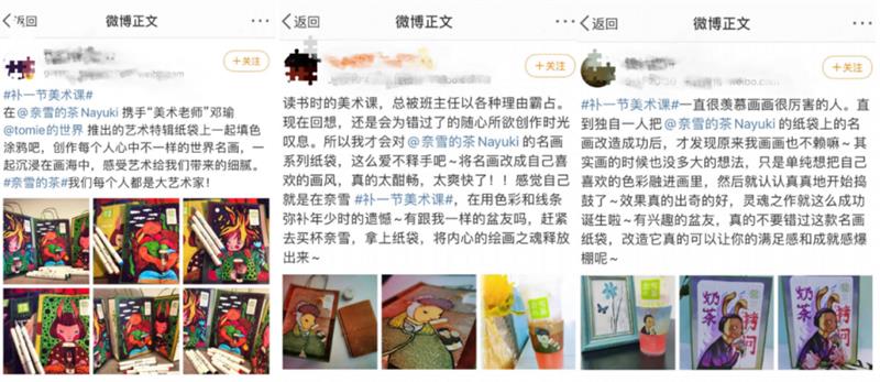 與此同時(shí),在微博話題#補(bǔ)一節(jié)美術(shù)課#中,可以看到網(wǎng)友們的各種天馬行空的創(chuàng)作。奈雪還在全國(guó)展開“尋找隱藏的6大名作”主題門店活動(dòng),并發(fā)起B(yǎng)站UP主創(chuàng)作名畫“刷彈幕奈雪捐茶”的活動(dòng)。