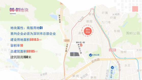 清水河06-01地塊:位于清水河一路與清水河三路交界處,建筑用地面積6918.5 m2,地塊屬性為商服用地C1,意向企業(yè)必須為深圳市總部企業(yè)。