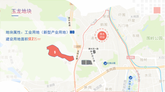 清水河玉龍地塊:位于銀湖山谷,東側(cè)臨近主干道玉坪大道,建筑用地面積177,000 m2,地塊屬性為工業(yè)用地(新型產(chǎn)業(yè)用地)M0。