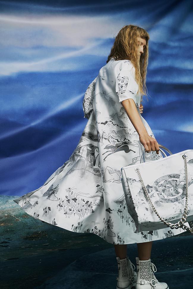本季從開場軍綠與卡其帶出軍裝元素,展現(xiàn)出木蘭踏上征途的勇氣及決心; 中段以大量黑白為基底,結(jié)合了獨家開版緹花以及手工刺繡圖騰,象征著沿路的風景以及心境上的轉(zhuǎn)變; 結(jié)尾則以迸發(fā)的色彩如正黃色、漸層的鮮綠以及粉紅、熒光桃粉,結(jié)合涂鴉印花,詮釋著經(jīng)歷一切后,一個女人生命旅程軸線的轉(zhuǎn)變,以及擁抱希望與未來的光輝。