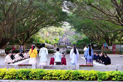 活動當(dāng)天上午,在清源山老君巖廣場前還舉行了莊嚴的請茶儀式。感德茶館八家入駐茶企、感德茶師傅行盥洗禮入座,由泉州漢服天下帶來請茶舞表演,現(xiàn)場品樂賞藝,同賞茶舞?!案械虏鑾?,技藝超群;匠心傳承,更勇?lián)?dāng)…”隨后,八位感德茶師傅列隊整齊,在老君巖前莊重地吟誦《感德茶師傅宣言》。吟誦完畢,感德茶館八家茶企代表、八位感德茶師傅舉起手中的茶杯,依次向老君奉茶。