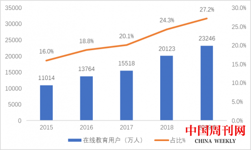 圖表:2015-2019年中國在線教育用戶規(guī)模及占整體網(wǎng)民用戶比例(來源:CNNIC)