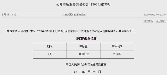 據(jù)央行官網(wǎng)消息,為維護月末流動性平穩(wěn),2023年2月22日人民銀行以利率招標方式開展了3000億元逆回購操作,中標利率為2.00%。