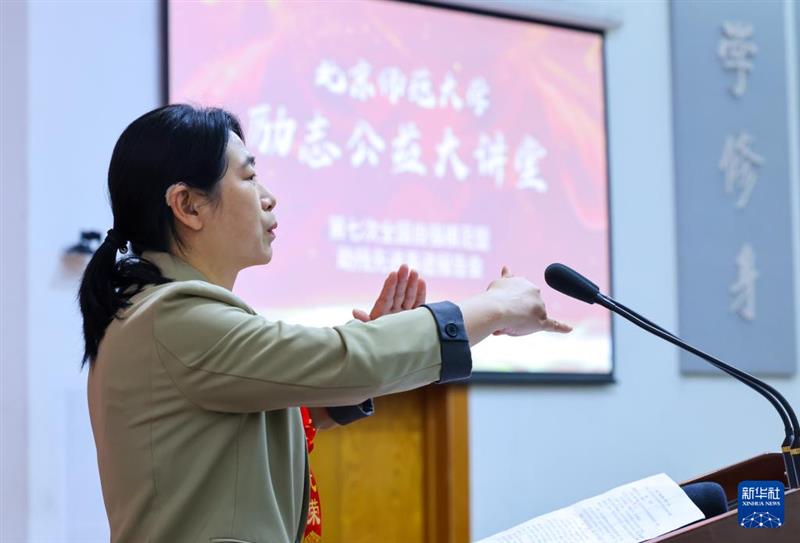 ??5月18日,清華大學聽障學生李堯在現(xiàn)場進行宣講。新華社記者 殷剛 攝