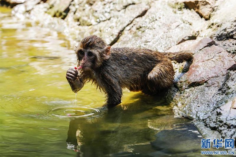 7月13日,鄭州市動(dòng)物園的一只猴子在水邊玩耍。