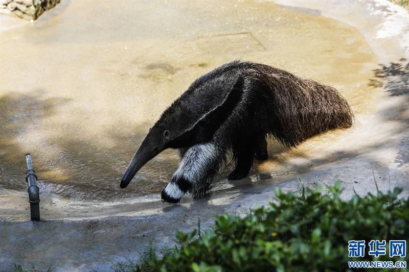 7月13日,鄭州市動(dòng)物園的一只大食蟻獸在水池邊納涼。