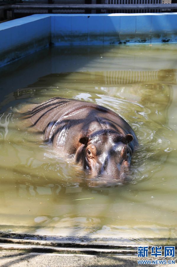 7月13日,鄭州市動(dòng)物園的一只河馬在水中享受清涼。
