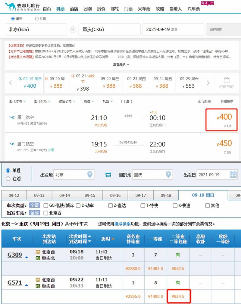 9月19日北京-重慶機(jī)票、高鐵價(jià)格對(duì)比