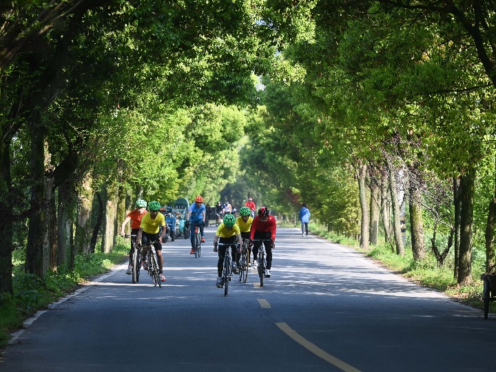 ↑4月8日,騎行愛好者在浙江省諸暨市趙家鎮(zhèn)香榧國家森林公園參加健身騎行活動(dòng)。