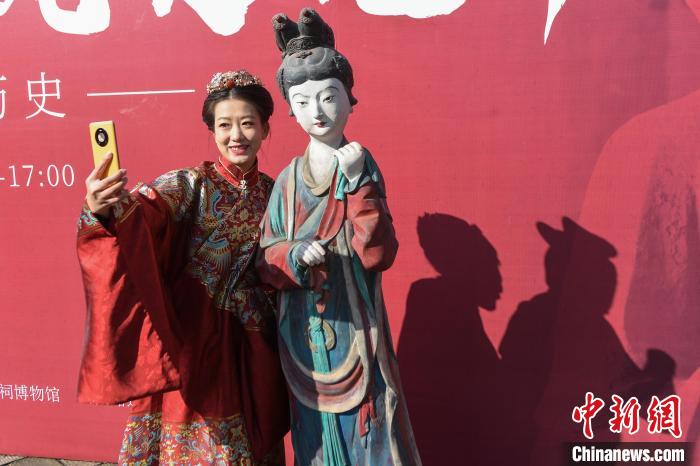 漢服愛好者在與侍女像雕塑(模型)合影?!∥淇〗?攝