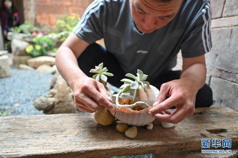 4月19日,蔡競(jìng)翔在被改造為海漂藝術(shù)品陳列館的老宅里為一個(gè)大貝殼裝上土,種植多肉植物。