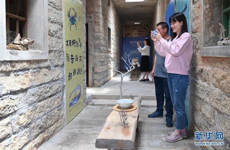 4月20日,游客在蔡競(jìng)翔的海漂藝術(shù)品陳列館里參觀“保護(hù)幼魚”主題展覽。