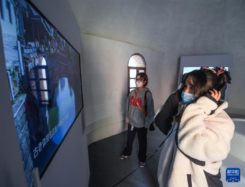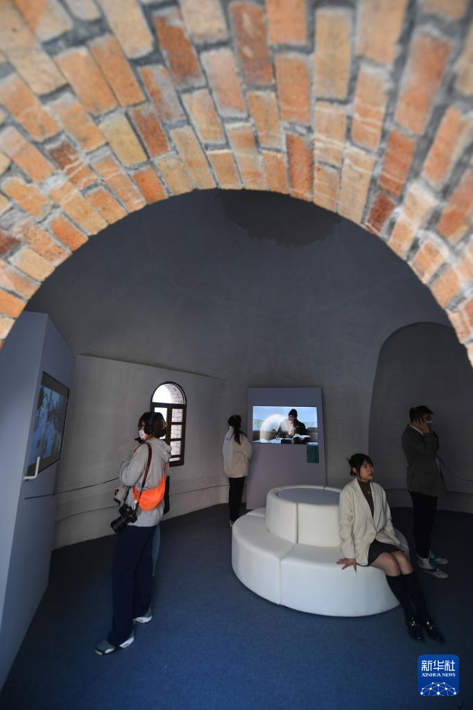 11月20日,游客在杭州市余杭區(qū)瓶窯鎮(zhèn)的特制“窯洞電影院”內(nèi)觀看電影短片。新華社記者 徐昱 攝
