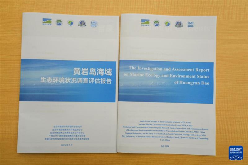 ??這是在北京的發(fā)布現(xiàn)場(chǎng)拍攝的《黃巖島海域生態(tài)環(huán)境狀況調(diào)查評(píng)估報(bào)告》中文版和英文版(7月10日攝)。新華社記者 張玉薇 攝