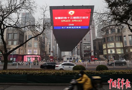 3月5日,北京世貿(mào)天階,車輛和行人從一處播放兩會(huì)會(huì)期信息的大屏幕附近駛過(guò)。 中青報(bào)·中青網(wǎng)記者 曲俊燕/攝
