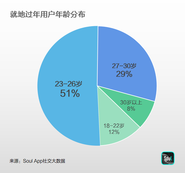 據(jù)鐵路部門、人力資源和社會(huì)保障部等多部門統(tǒng)計(jì),今年全國有超過1億人就地過年。Soul社交大數(shù)據(jù)顯示,春節(jié)7天假期中留在原地過年的用戶占比高達(dá)69%,其中22-25歲的職場新人占比達(dá)5成,其次是27-30歲年齡段用戶,占比近3成。在男女比例方面,女性用戶比男性更愿意嘗試新過年方式,就地過年的人數(shù)比例高出20%。