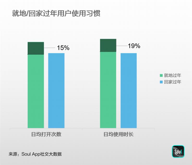Soul社交大數(shù)據(jù)顯示,春節(jié)期間,就地過年用戶在App打開次數(shù)和使用時(shí)長上,均較回家過年用戶高出近20%。在社交平臺(tái)上,就地過節(jié)的年輕人們通過分享和交流豐富多彩的生活瞬間,舉辦了一臺(tái)屬于年輕人的、熱鬧非凡的線上“春會(huì)”。