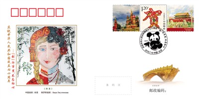 中國(guó)—俄羅斯紀(jì)念封以中俄藝術(shù)家合作的油畫(huà)《和美》為主圖,展示了一位美麗少女的形象。少女一半是中國(guó)面孔,身著典型戲劇裝扮,背景是代表中國(guó)特色的挺拔翠竹;另一半是俄羅斯面孔,身著俄羅斯傳統(tǒng)服飾,背景是代表俄羅斯風(fēng)情的亭亭白樺。