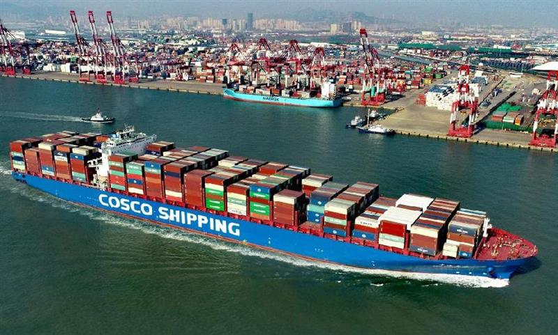 2月19日,在位于山東自貿(mào)試驗(yàn)區(qū)青島片區(qū)的山東港口青島港前灣集裝箱碼頭,一艘滿載集裝箱的貨輪駛出港口(無(wú)人機(jī)照片)。新華社發(fā)(張進(jìn)剛 攝)