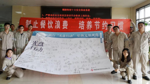 興澄特鋼后勤部在各食堂入口處設(shè)立“厲行勤儉節(jié)約、反對(duì)鋪張浪費(fèi)”的宣講牌。工會(huì)組織公司志愿者每天中午在各個(gè)食堂現(xiàn)場進(jìn)行“光盤行動(dòng)”的宣傳及督導(dǎo)。
