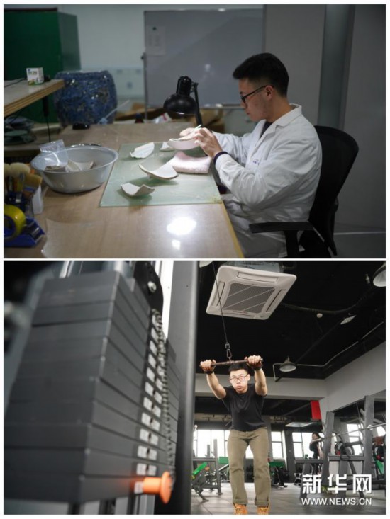 拼版照片:上圖為修復(fù)師龔尚開源在工作室修復(fù)瓷器(12月2日攝);下圖為龔尚開源在健身房健身(12月3日攝)。新華社記者 周密 攝