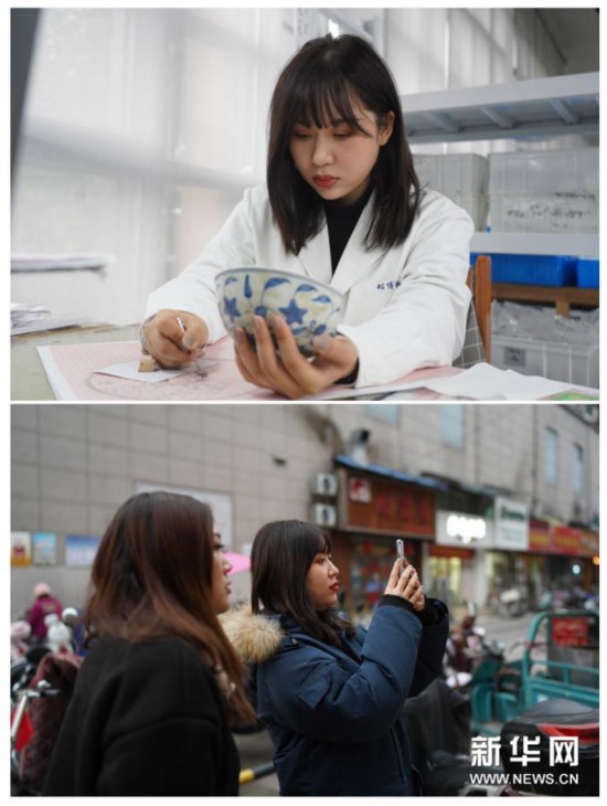 拼版照片:上圖為修復(fù)師何奕慧在工作室繪制一件瓷器的紋樣;下圖為何奕慧在景德鎮(zhèn)一條商業(yè)街上,與好朋友拍攝抖音視頻(12月3日攝)。新華社記者 周密 攝