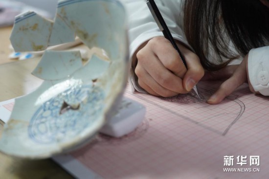 修復(fù)師何奕慧在測(cè)量繪制一件瓷器的圖案,將三維瓷器上的圖案還原到二維的紙面上,必須要經(jīng)過仔細(xì)的測(cè)量(12月3日攝)。新華社記者 周密 攝