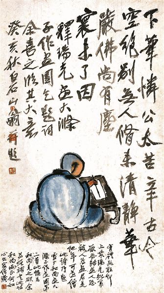 此次展出的一張《鐘馗圖》,齊白石就在題款上寫明瑞光在古代的瓷器上看見了鐘馗的形象,覺得好,就放大了畫成一幅畫,呈給自己指點(diǎn)。自己改完了覺得確實(shí)好,便也畫了一張。齊白石還作有多幅《大滌子作畫圖》,也源于弟子瑞光。瑞光一生傾心于石濤(別號(hào)大滌子),他將自己畫的《大滌子作畫圖》交予齊白石評(píng)定,齊白石修改后,也幾度創(chuàng)作《大滌子作畫圖》,并且在題跋里談及瑞光在人物畫方面的探索,也提到了自己作品的來源。