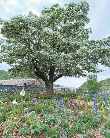 古樹高約13米,主干1.3米處分為兩主枝,向上延展成蘑菇形樹冠,平均冠幅約16米。幾許山風(fēng)輕拂,花葉零星飄落,暗香幽微?!?月10日,古樹進入盛花期,白色小花很快從陽面鋪到陰面。”蘇家峪村黨支部書記王銀江說,上世紀80年代,村里修建了周長16米的金屬護欄,以保護古樹。“我們打小兒就知道這是一棵很老的樹,不過就連父輩都說不清它的歲數(shù)。還是前些年專業(yè)部門來測量,我們才知道古樹有580歲了?!?/p>