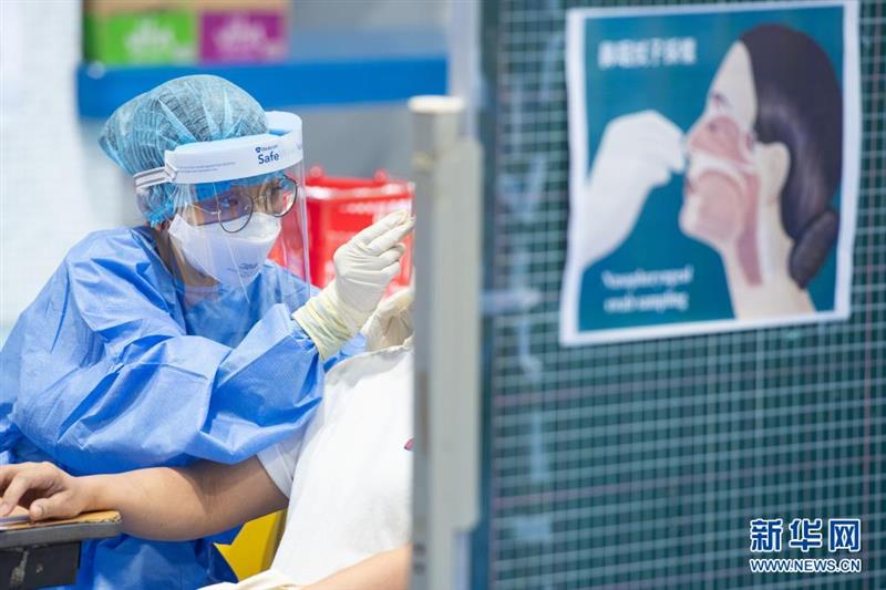 8月4日,一名醫(yī)護人員在澳門利瑪竇中學全民核酸檢測站為市民采樣。新華社記者 張金加 攝