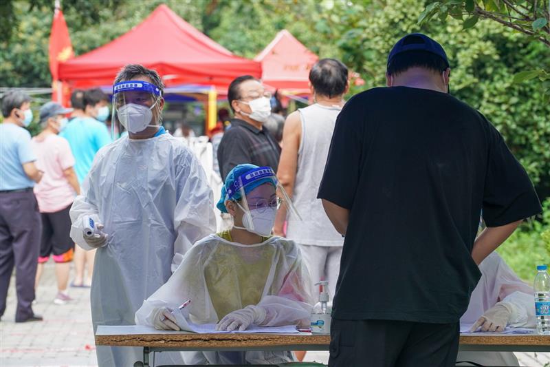 8月17日,市民在揚州市梅嶺街道鴻福二村核酸采樣點排隊,準(zhǔn)備進(jìn)行核酸檢測取樣。新華社記者 李博 攝