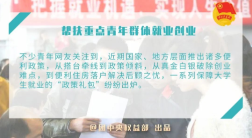 不少青年網(wǎng)友關(guān)注到,近期國家、地方層面推出諸多便利政策,從搭臺牽線到政策傾斜,從真金白銀破除創(chuàng)業(yè)難點(diǎn),到便利住房落戶解決后顧之憂,一系列保障大學(xué)生就業(yè)的“政策禮包”紛紛出爐?!丁笆奈濉本蜆I(yè)促進(jìn)規(guī)劃》中還首次明確提出了促進(jìn)青年就業(yè),并作出了單獨(dú)的部署安排。此外,網(wǎng)友紛紛點(diǎn)贊團(tuán)中央對低收入家庭畢業(yè)生的就業(yè)幫扶計(jì)劃,但受逐年增多的畢業(yè)人數(shù)和疫情的持續(xù)影響,高校畢業(yè)生就業(yè)形勢依舊嚴(yán)峻。