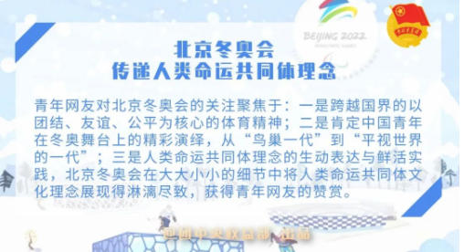 青年網(wǎng)友對北京冬奧會(huì)的關(guān)注聚焦于:一是跨越國界的以團(tuán)結(jié)、友誼、公平為核心的體育精神;二是肯定中國青年在冬奧舞臺上的精彩演繹,從“鳥巢一代”到“平視世界的一代”;三是人類命運(yùn)共同體理念的生動(dòng)表達(dá)與鮮活實(shí)踐,北京冬奧會(huì)在大大小小的細(xì)節(jié)中將人類命運(yùn)共同體文化理念展現(xiàn)得淋漓盡致,獲得青年網(wǎng)友的贊賞。